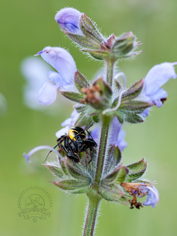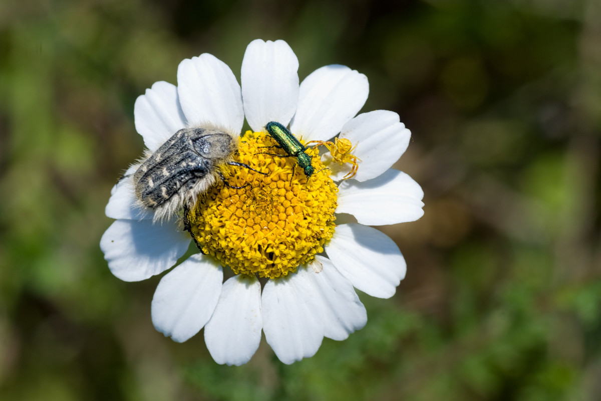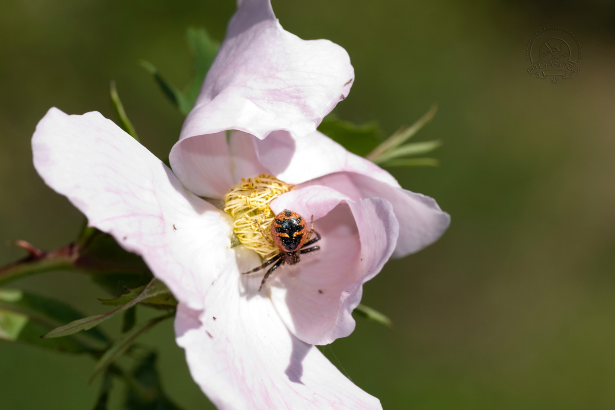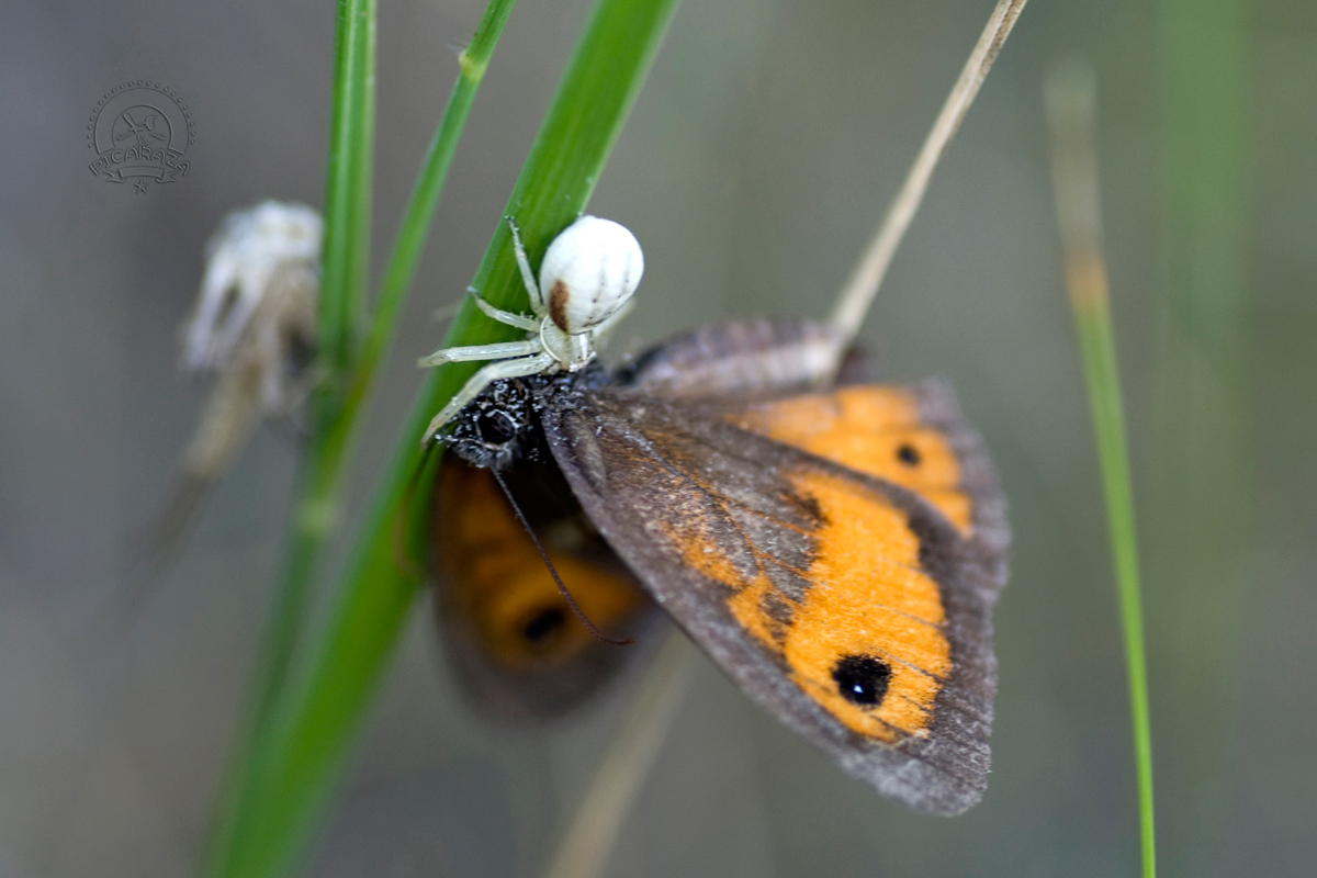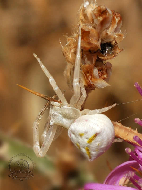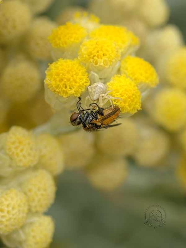 Los tomísidos (Thomisidae) son una familia de arañas araneomorfas conocidas popularmente como arañas cangrejo, debido al gran tamaño de los dos primeros pares de patas y a su capacidad para desplazarse lateralmente. Esta es una gran familia con más de 3000 especies conocidas. Son un depredador al acecho. Se agazapan principalmente entre los pétalos de las flores y esperan a que los insectos vuelen o pasen por sus proximidades. Como se puede comprobar en las imágenes inferiores, a menudo cierran los pétalos de las flores pegándolos con su seda y creando así un pequeno hide, donde se esconden al acecho. Con sus cortas patas posteriores la araña se sujeta al sustrato. Las patas anteriores, que se mantienen en posición abierta, son mucho más potentes y agarran a los incautos visitantes florales con sorprendente velocidad, al tiempo que le propinan un mordisco venenoso. Las presas son consumidas sobre la propia flor y el contenido de las mismas se succiona a través de dos diminutos orificios, de modo que solo se deja un exoesqueleto seco casi intacto.